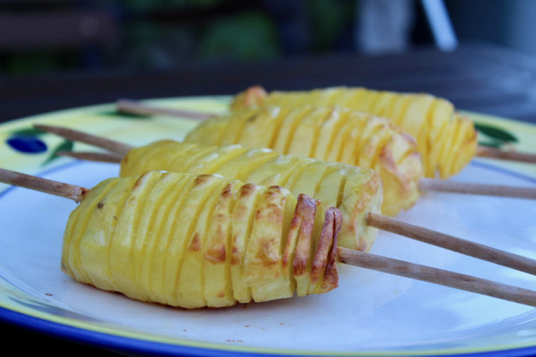 - Kartoffeln und Zucchini auf einen Bambusspieß stecken und dann ringsum mit einem Messer oder einem speziellen Spiralschneider zu einer Spirale schneiden – ein echter Hingucker!